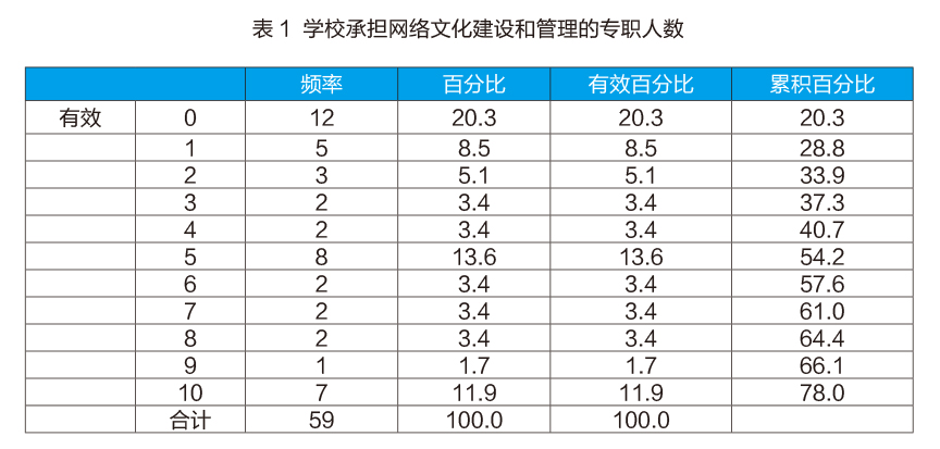 根据问卷调查的结果,59所学校中有12所学校没有承担网络文化建设和管理工作的专职人员,比例达到20.3%。在设有专职人员的高校之中,有20所学校的专职人员在5人及以下,14所学校的专职人员在6至10人,仅13所学校的专职人员在10人以上,参见表1。