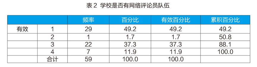 在学校网络评论员队伍方面,教育部试点高校均有较为健全的网络评论员队伍,但是问卷调查中的59所高校中,有29所学校没有网络评论员队伍,占49.2%;1所学校虽然有网络评论员队伍,但是没有实际开展过工作;22所学校尝试性开展了工作。有7所学校有效开展了工作,比例仅占11.9%,参见表2。