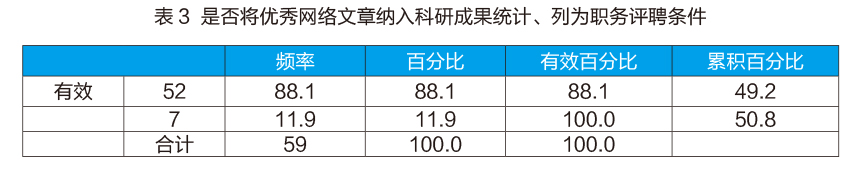 《关于进一步加强和改进新形势下高校宣传思想工作的意见》中明确指出“要创新网络思想政治教育,开展高校校园网络文化建设专项试点工作,探索建立优秀网络文章在科研成果统计、职务职称评聘方面的认定机制。”通过调查发现,尽管少数高校进行了积极的探索和尝试,但是并没有取得特别实质性的进展。