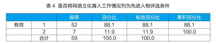 在通过问卷方式调查的59所高校中,关于是否将优秀网络文章纳入科研成果统计、列为职务(职称)的评聘条件中,52所学校没有相关方案,达到88.1%,有7所学校有方案,仅占11.9%,参见表3。关于学校是否将网络文化育人工作情况列为优秀教师、优秀教育工作者等先进人物评选条件方面,52所学校没有相关方案,占88.1%,7所学校有方案,占11.9%。其中,只有两所高校同时具备以上两点激励机制,参见表4。