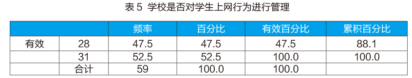 通过调查分析不难发现,当前高校对于学生上网行为的管理和引导力度不足。在问卷调查中,关于学校是否对学生上网行为进行管理中,有28所学校表示未对学生的网络行为进行管理,占47.5%,占调查高校的近一半,参见表5。