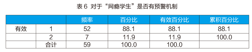 关于学校是否有“网瘾学生”预警机制问题,52所学校没有,占88.1%,7所学校表示有预警,仅占被调查学校的11.9%,参见表6。