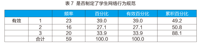 关于学校是否已制定学生网络行为规范中,有23所学校暂无学生网络行为规范,比例达到39%;16所学校有学生网络行为规范,但在学校学生违纪处理办法中尚无相应条款,占27.1%;仅有20所学校有学生网络行为规范,且在学校学生违纪处理办法中有相应条款,比例只有33.9%,参见表7。