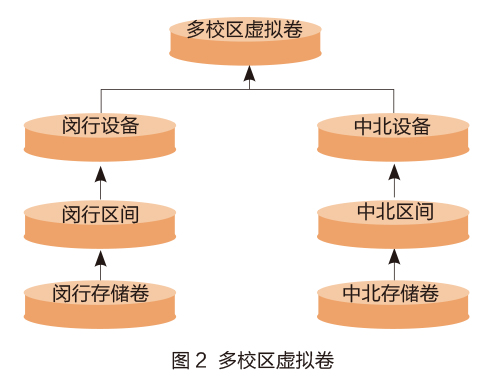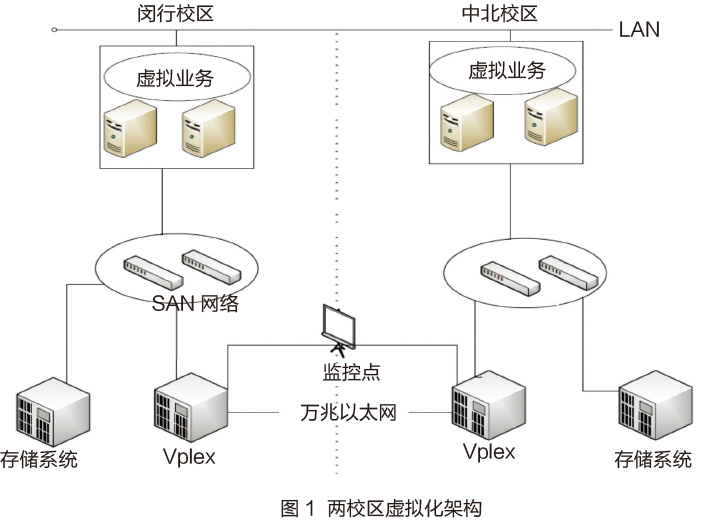 华东师范大学闵行校区和中北校区的多校区虚拟化平台实施部署时,中北校区和闵行校区现有网络架构,服务器层面通过VMware vSphere来实现服务器虚拟化。存储层面通过EMC vplex设备创建虚拟卷为虚拟化平台提供共享存储。通过服务器和存储虚拟化技术,在中北校区与闵行校区搭建两校区虚拟化平台。其基本架构如图1所示。