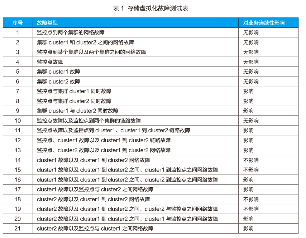 在两校区通过部署EMCvplex设备来实现存储层面的虚拟化,并在第三点故障域部署监控点,主要用于两校区vplex设备的健康监测与故障切换。存储虚拟化测试主要针对vplex设备及监控点进行测试,假定vplex设定规则为集群cluster1作为胜利者,测试结果参见表格1。
