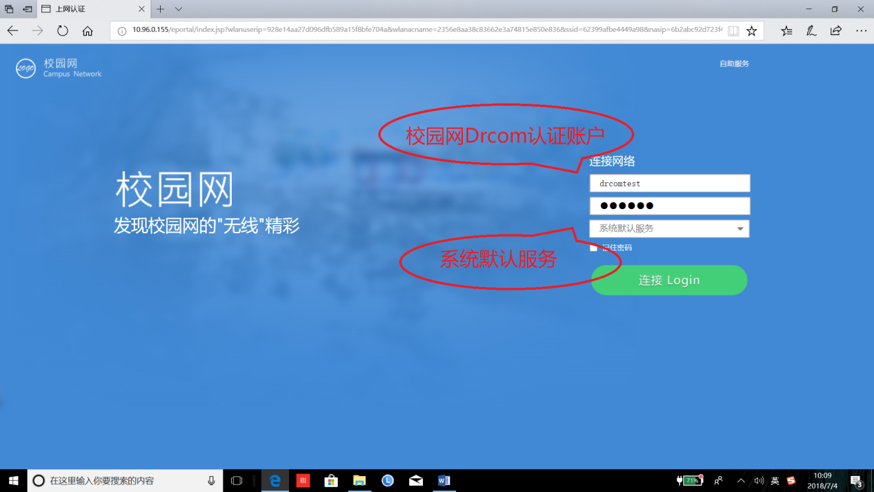 先输入正确的校园网Drcom认证账户和对应的密码,下拉选择“系统默认服务”或“default”,点击“连接”。认证成功后即可通过校园网Drcom认证账户访问因特网。