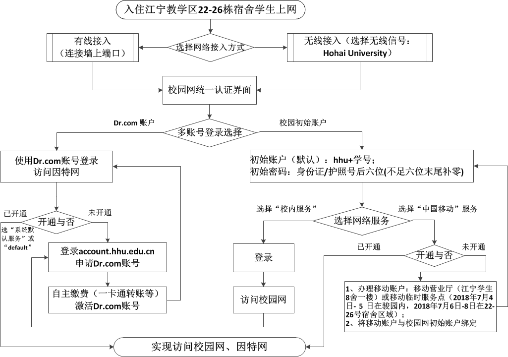 学生在江宁校区22-26号宿舍楼内使用校园网,有无线和有线两种接入方式。无线网络信号名称为:Hohai University。