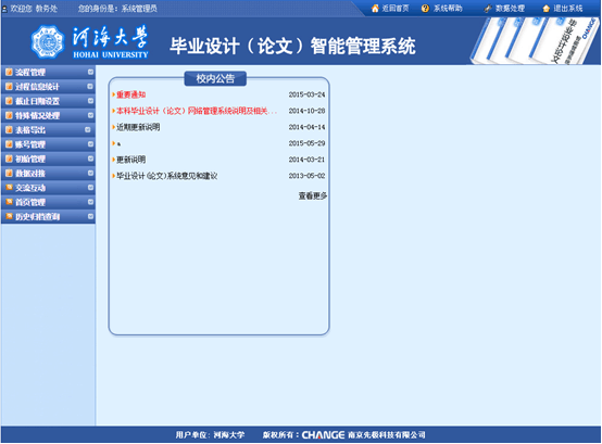 河海大学毕业设计(论文)管理系统自2007年开始投入建设,是河海大学自主设计、自主研发的一款管理系统。系统于2008年建成后,开始在水文院、环境院、材料院、外语院四个学院进行试点运行,并取得了良好的效果。自2009年起,该系统在全校范围内投入使用。我校毕业设计(论文)管理系统经历了从无到有的过程,实现了我校毕业设计(论文)从纸质化管理向网络化管理的转变。