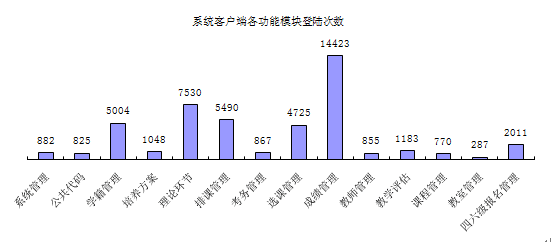 系统中教务处管理人员和各院系教学秘书围绕教学管理流程常用功能模块为学籍管理、理论环节、排课管理、选课管理、成绩管理。系统客户端各功能模块登陆次数如图2。统计显示,系统网页端教师和学生以及教辅人员常用业务为选课、成绩录入、教学评估、综合查询、教学资源查询等。学生和教师集中访问系统主要集中在每学期选课和成绩录入期间。