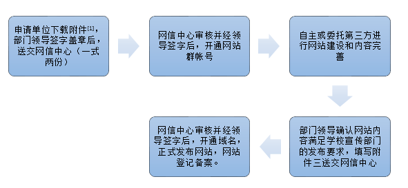 有建站需求的校内单位和部门,可向网络与信息管理中心申请平台使用帐号。开通网站群平台帐号后,部门可自主或委托第三方人员进行网站模板制作和上传,以及维护需要发布的栏目和内容。完成上述工作后并测试正常后,可申请网站正式发布,发布后的网站就可以被访问了。